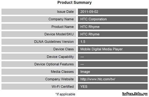 Смартфон HTC Rhyme, разрабатываемый в сотрудничестве с американским оператором Verizon Wireless, прошел сертификацию DLNA под модельным номером ADR6330VW.
