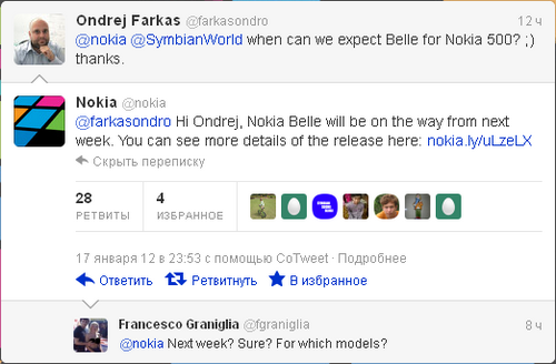 Это следует из комментария Nokia на официальном Twitter-канале. Пока непонятно, для каких смартфонов выйдет обновление. Ранее компания собиралась выпустить апдейт в феврале для моделей Nokia 500, N8, E7, E6, X7, C6-01, C7 и Oro. Nokia Belle предложит шесть рабочих столов, новые виджеты и приложения, удобное главное меню и многое другое.