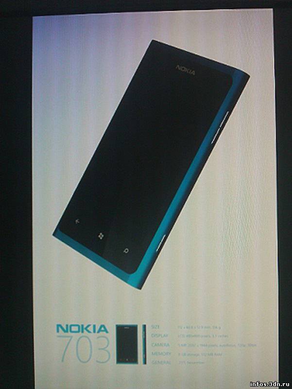 Вчерашняя новость о том, что Nokia разрабатывает модель Nokia 703 с Windows Phone в основе, подтвердилась. По изображению можно оценить ее дизайн и узнать некоторые технические характеристики. Nokia 703 похож на Nokia N9, из чего можно было бы сделать вывод о том, что перед нами модель Sea Ray. Однако «морской луч» получит 3,9” сенсорный экран, тогда как в Nokia 703 используется 3,7” панель. Другие спецификации со слайда: 512 Мб оперативной памяти, 8 Гб памяти для хранения контента, разрешение –